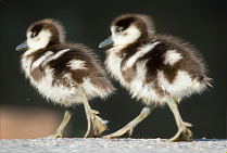 Two Egyptian goslings walk along the River Main in Frankfurt,