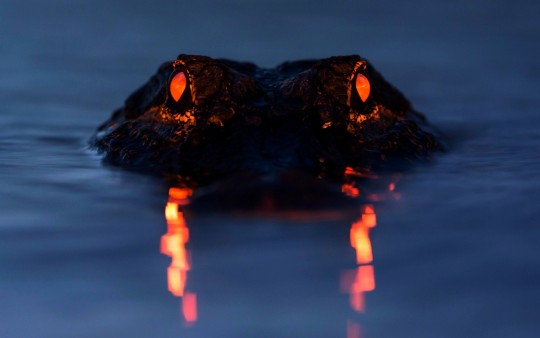 Sunset reflected in an alligator's eyes, which are reflected in