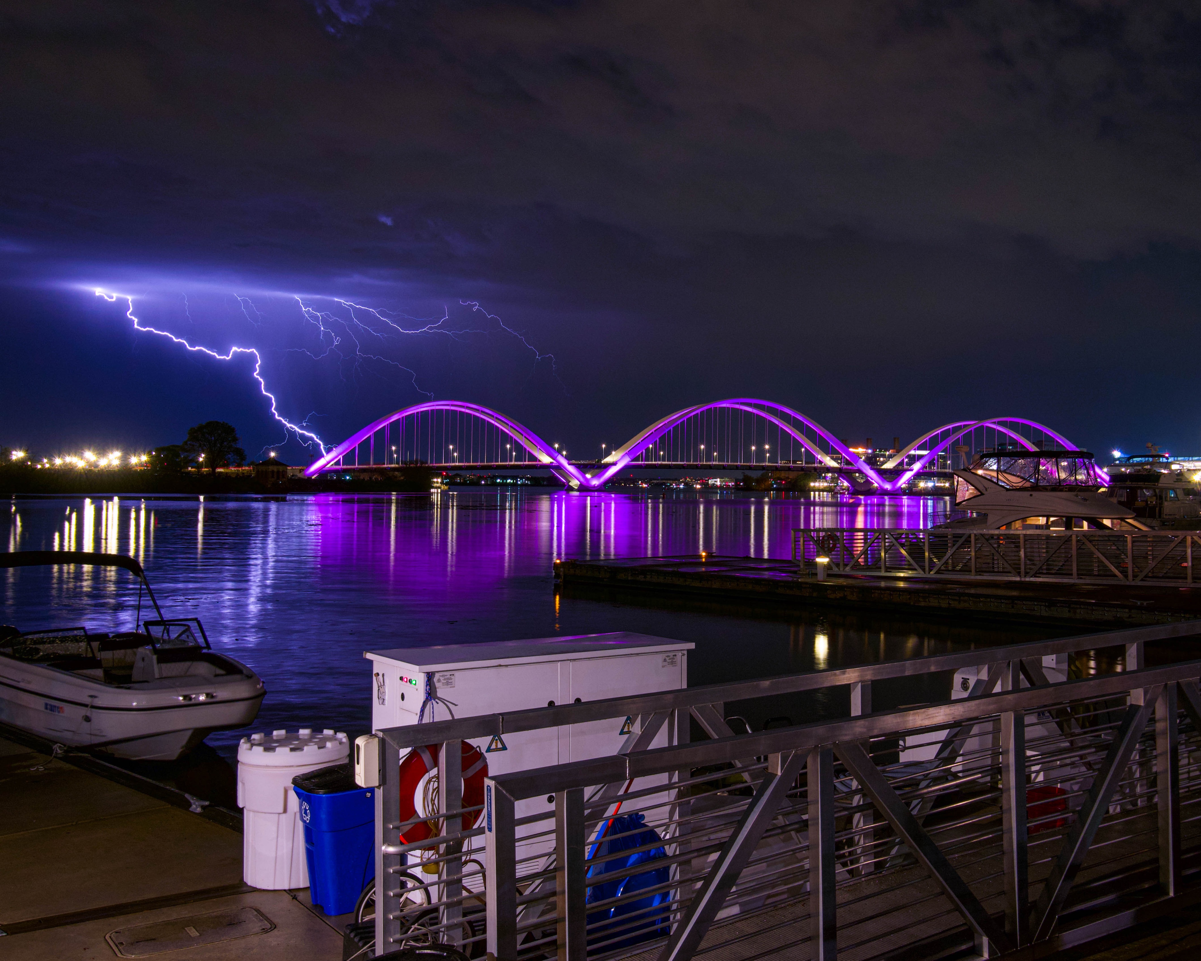 Lightning over the Capitol Riverfront in Washington DC, showing a