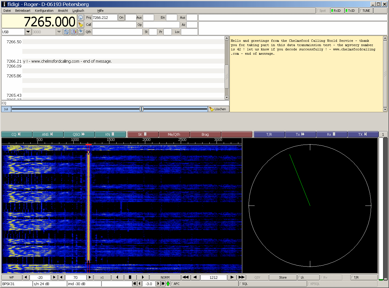 Hello and greetings from the Chelmsford Calling World Service - thank you for taking part in this data transmission test - the mystery number is 42 ! let us know if you decode successfully ! - www.chelmsfordcalling.com - end of message.